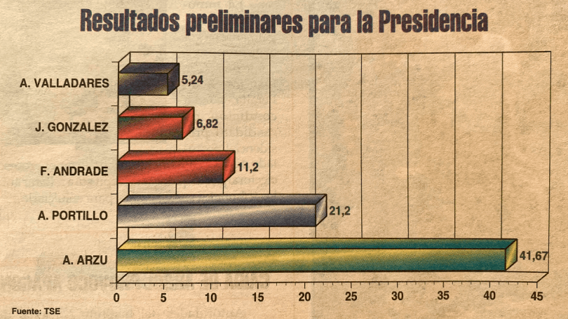 Cuando empiezan a salir los resultados de la primera vuelta, Arzú poderosamente aparece en primer lugar y duplicaba los números del segundo lugar, 41 a 21, pero no le alcanzaba para ganar en una vuelta.